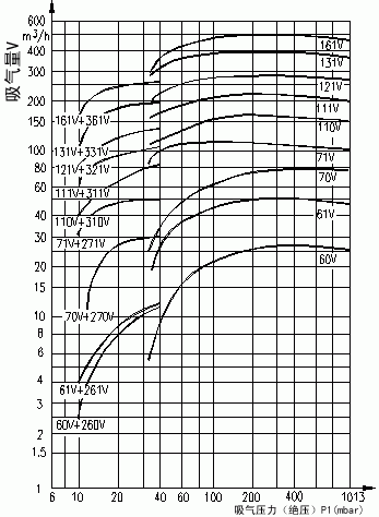 ③本例中為71V 注:該性能曲線是在吸入介質(zhì)為20℃的飽和空氣,工作液溫度15℃,排氣壓力1013mba的狀態(tài)下得到的。性能允許差±10%,下圖為配用大氣噴射器的性能曲線。